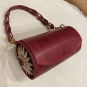 その花の存在感をサイドにあしらったワイン色の特別なバッグです。